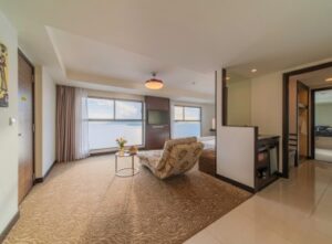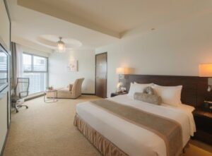 Phòng Junior Suite King bao gồm 1 phòng ngủ rộng kết nối với 1 phòng tắm riêng biệt có trang bị bồn sục thủy lực với tầm nhìn trực diện hướng biển. Những tiện nghi hiện đại phục vụ cho nhu cầu nghỉ dưỡng và làm việc của bạn được bố trí đầy đủ trong phòng như chiếc giường đôi cỡ lớn vô cùng êm ái với tầm nhìn thoáng rộng ra biển, khu vực bàn trang điểm/ làm việc yên tĩnh riêng tư được bố trí hài hòa bên cạnh ghế sofa. Thú vị hơn nữa là ngay cả khi thư giãn ngâm mình trong bồn sục thủy lực, bạn vẫn có thể thỏa thích ngắm cảnh biển thơ mộng trải dài về phía chân trời.